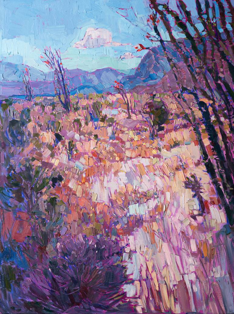 Borrego Springs in California's southern desert becomes alive with color in the springtime. The desert scrub blooms with purple and yellow flowers, while the stately ocotillos give birth to bright red, bird-like flowers. This oil painting is painted with loose, painterly brush strokes, creating a se...