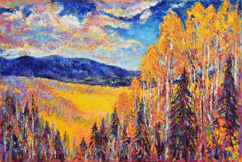 The changing aspens and darkening of the pines in northern New Mexico and southern Colorado inspired this dramatic artwork, showcasing fall at its most colorful. Barbara's use of a palette knife resulted in textured, multi-dimensional and vibrant color. This piece is currently for sale, sides painte...