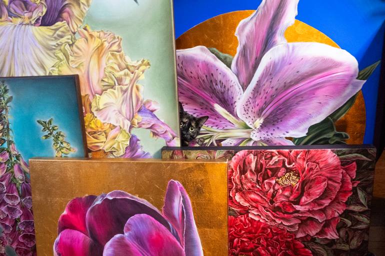 The idea of my floral art collection was to present enlarged colourful plants painted on the gold leaf background, which reflects the light beautifully and emphasize the innocence of flowers. Depending on the light angle and intensity the subject appears differently on the background, it changes the...