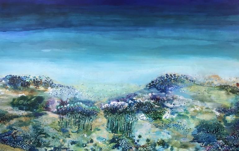 The work was inspired by a dream. The painting is a fantasy world of an intriguing landscape or is it a seascape? The viewpoint is entirely up to the audience. Floating marks could be phosphenes or water bubbles. I am fascinated by the marriage of colours and mark making. They should lead you thr...