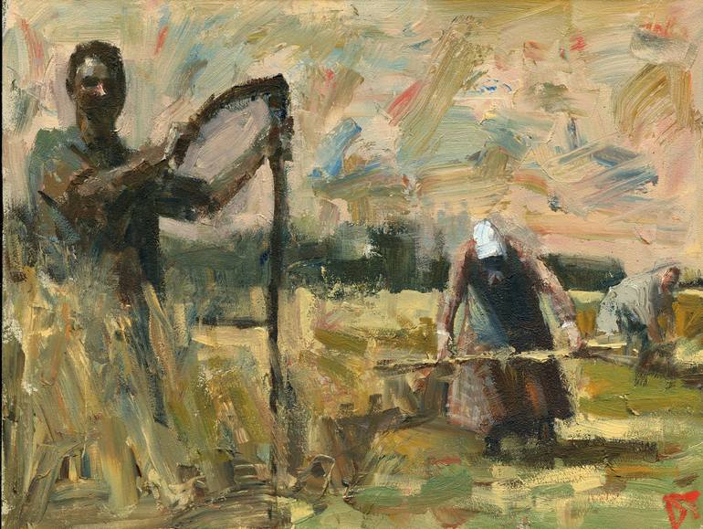 Of the Earth is part of a series depicting labor themes. As in most of my paintings, I use subdued colors and loose brush strokes in order to create the mood and feel of spontaneity. Art buyers may see a symbolic reference to prominent 20th century American painters like George Bellows, John Sloa...