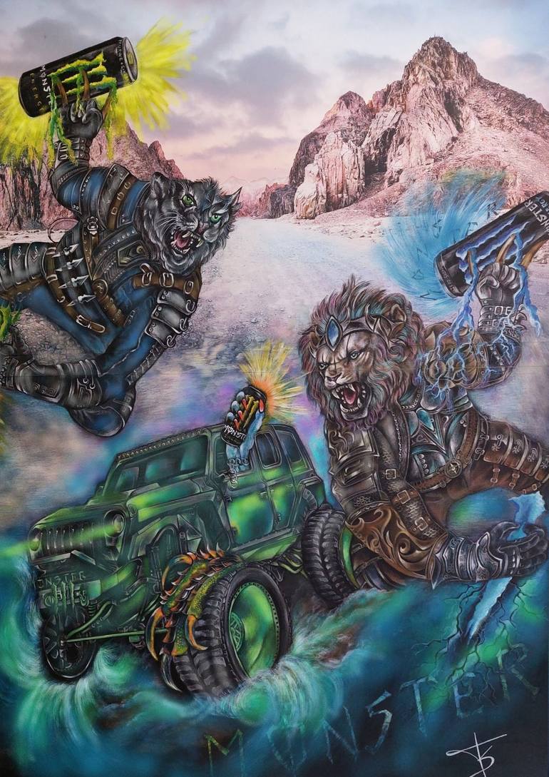 Mein Werk, eine Verbindung von Wild und Wunderbar, mit einem Hauch des Unmöglichen. Acrylfarben und Pastellstifte, in Mixed Art Technik, lassen eine surreale Szenerie entstehen, in der mechanische Bestien und ein robustes Offroad-Fahrzeug eine dynamische und fast lebendige Symphonie der Bewegung bil...