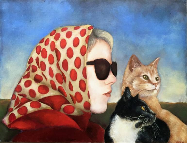 Whimsical portrait of travel with cats, beauty of polka dot scarf