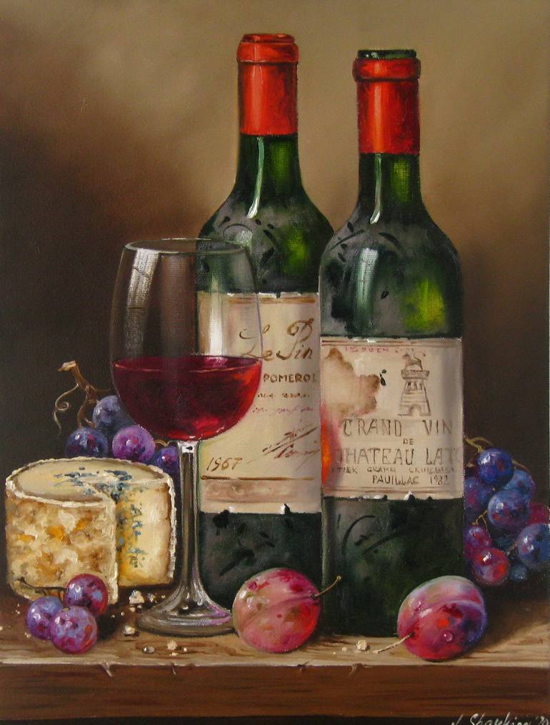 Add a touch of elegance to your bar or wine cellar with this stunning original still life oil painting. The depiction of a bottle of wine surrounded by luscious fruits including grapes and lemons creates a realistic artwork that will surely impress your guests. This classic fine art piece is ideal f...