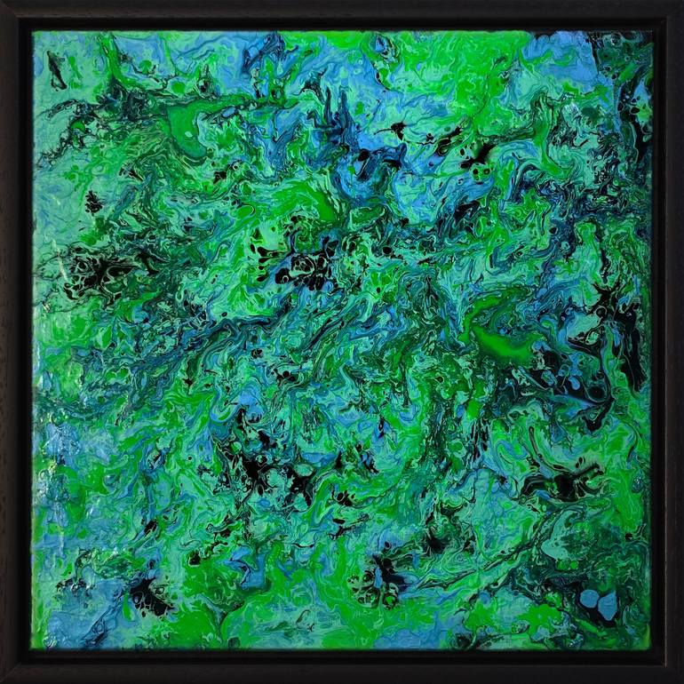 Oil Spill is a beautiful green blue and black abstract painting. Samuel has applied plaster to a 30cm x 30cm canvas and then covered the surface with pouring paints to create this striking artwork. The powerful black drops and dribbles amongst the vibrant green and blue lead Samuel to the name Oil...
