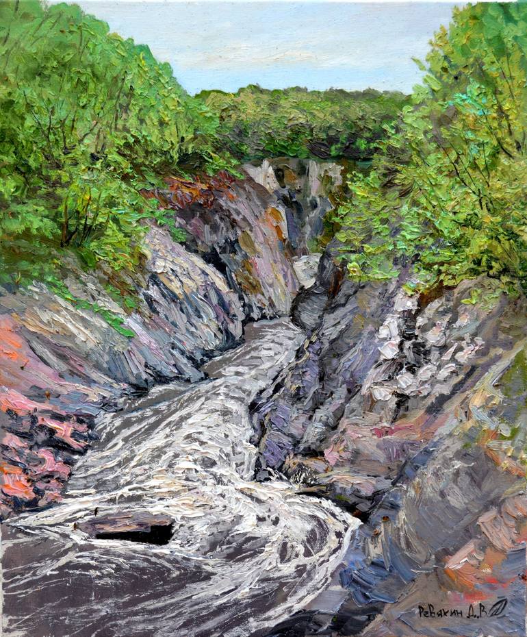 Oil painting landscape Rocky gorge with rough river. Painted plein air by contemporary famous Russian artist Dmitry Revyakin on linen stretched canvas with quality oil paints Norma, Mussini. Anyone will love to have this impressionism oil painting with rocky cliffs and river in an art gallery. The r...