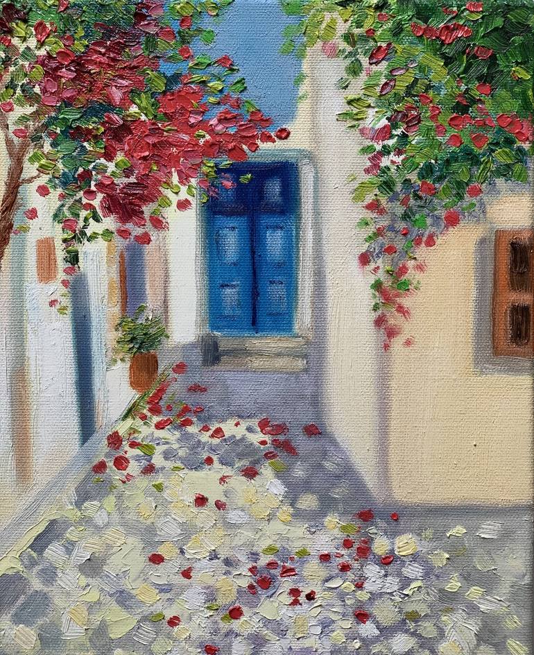 I’m always amazed at the beauty of the white greek houses surrounded by pink flowers. Old Santorini lane with beautiful bougainvillaea is an oil painting on an 8 x 10 inches stretched canvas. It is textured with a palette knife and is ready to hang on the wall. Feel free to get in touch with me ...