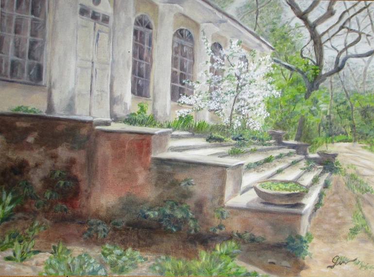Old country house. The Park around blooms in the spring. Cherry blossoms. This romantic place met the author on one of his trips and won over with its charm. It's great to wander around the old Park and immerse yourself in its history. This picture will perfectly enliven and decorate your interior. ...