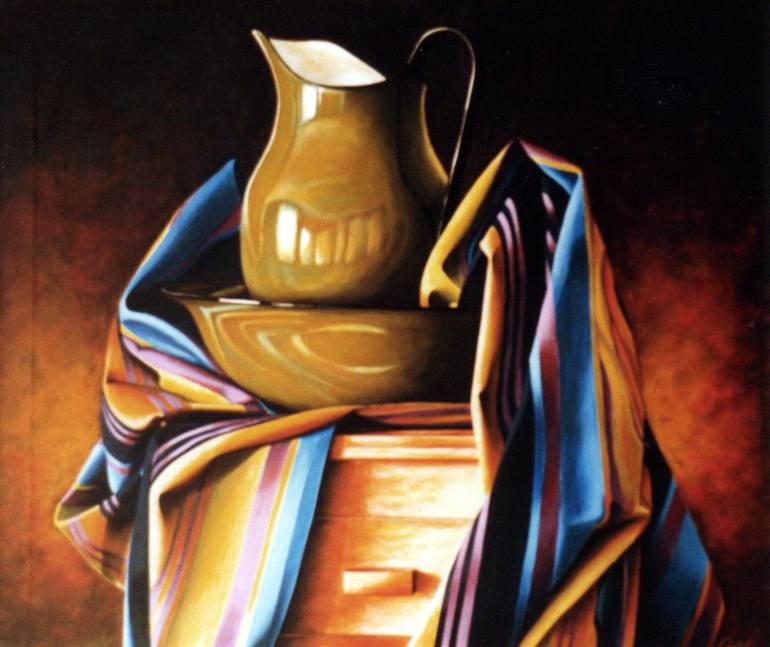 Old Wash stand in enamal set, arranged with material on drawer furniture. In the past the house keeper put every day clean water in a wash candle for the person who hired a room. Myself I experienced this, too, when I was young My paintings from the 1980' s are all well-kept in my privately owne...