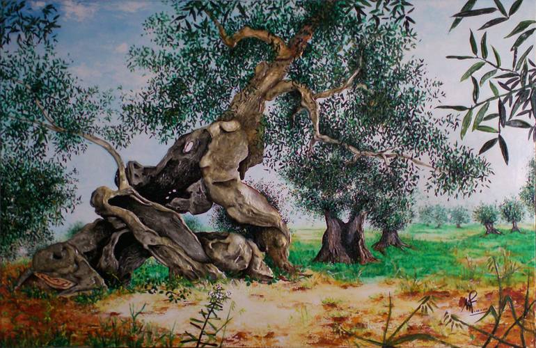 Olive grove with centenary olive tree, mixed technique, acrylic, resins and glass wool. Vision of a landscape. The painting depicts a splendid Apulian landscape in Italy with warm colors, characteristic of the area. The Colorist depicts Apulian rural landscapes, places, to which he is particularly a...