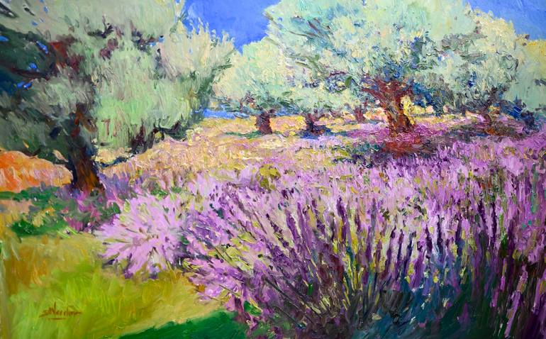 Soft turquoise-green shades of olive trees are in color harmony with lavender flowers. Together they create a peaceful Mediterranean vibe. Impasto brushstrokes and thick texture make the painting very dynamic. The artwork is painted on oil-primed canvas, stretched on wooden bars. It has a wire on th...