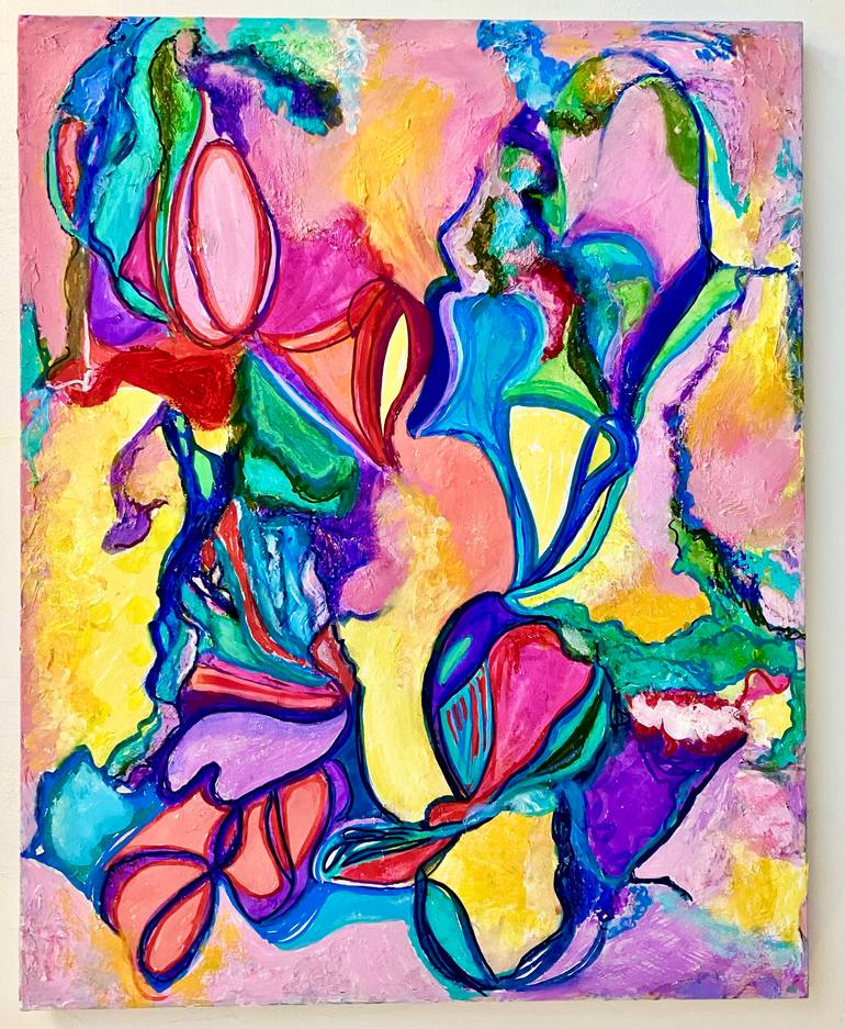 Anne Hurst has been studying many forms of Art over the decades. With her love of composition, movement and bright colours, her art is recognizable as abstract expressionist. In each painting Anne uses symbolism, and leaves a hidden code, Colours ranging from blue, to yellow, red and greens mingle with each other in an intense swirl. The areas of color relate while retaining their individuality, and communicating an interest story. It is the explosion of instinct, when Anne stands in front of the canvas and pours her emotions, thoughts, but also strength and energy onto the canvas. This is a powerful and intense narrative that slowly transports us into its articulated meanderings, and we the viewers cannot help but be guided on this mysterious journey of which Anne is the creator, unaware of what the destination will be, but you can be assured that the journey will be a powerful emotion, well worth seeing and feeling.