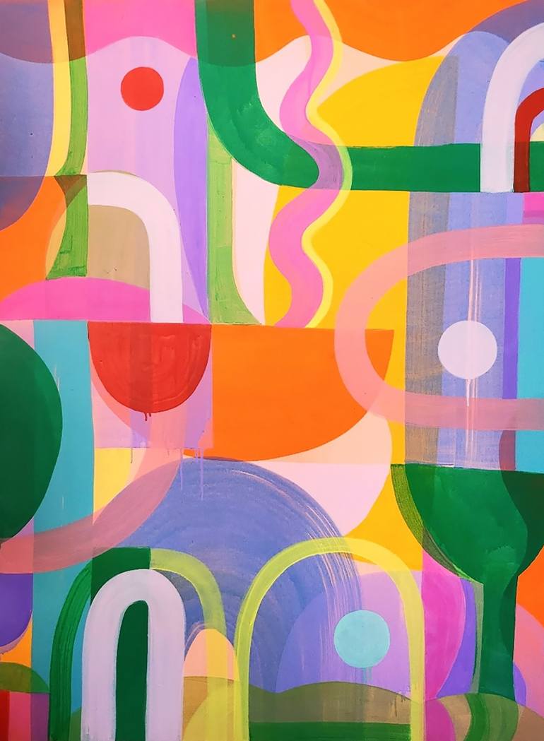 This vibrant geometric abstract captures a playful and hopeful energy, with bold colors and dynamic shapes interwoven in layers. The composition evokes a sense of freedom and possibility, where stories unfold and refresh, memories fade and reappear, and imagination takes flight. The orange chair bec...