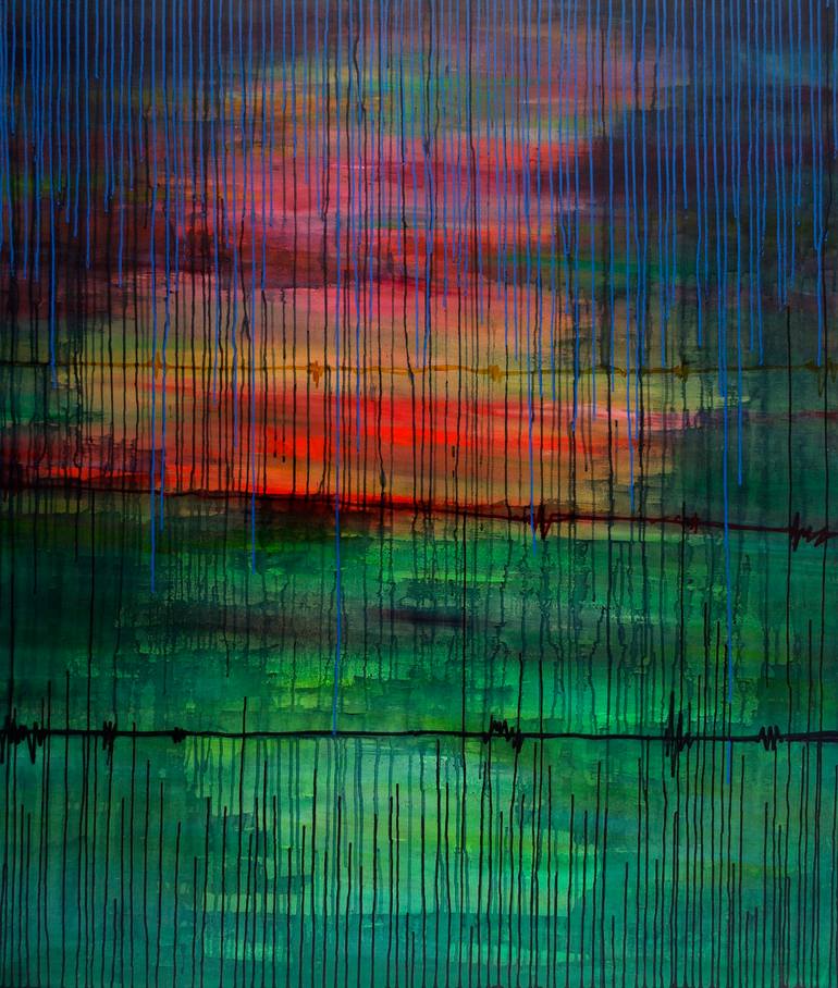 This painting unfolds as a meditative chronicle of migration and memory, distilled through a disciplined yet emotionally charged abstraction. The painting’s deep emerald base anchors the composition, suggesting rootedness and the weight of origin. Above it, a radiant field of red, orange, and yellow...