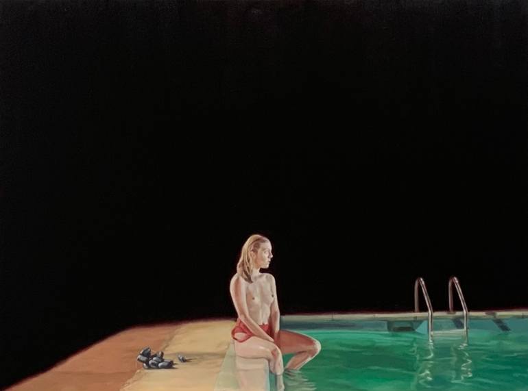 'On the Moon' is painted from a still taken from Peter Greenaway's 1988 film 'Drowning by Numbers'. I chose this image and named the painting because it evoked a (beautiful) sense of isolation, hence my title, 'On the Moon'.