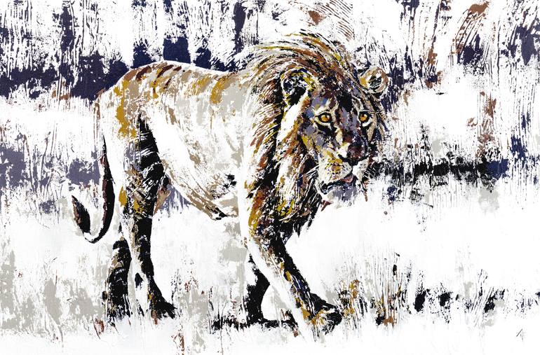 A painting of a male Lion where I strive to capture the strength and gait of the animal as he walks along powerfully and on the alert. This image is designed to express the movement and force of the animal using movement and texture in the background, suggesting rather than illustrating. It is a mix...