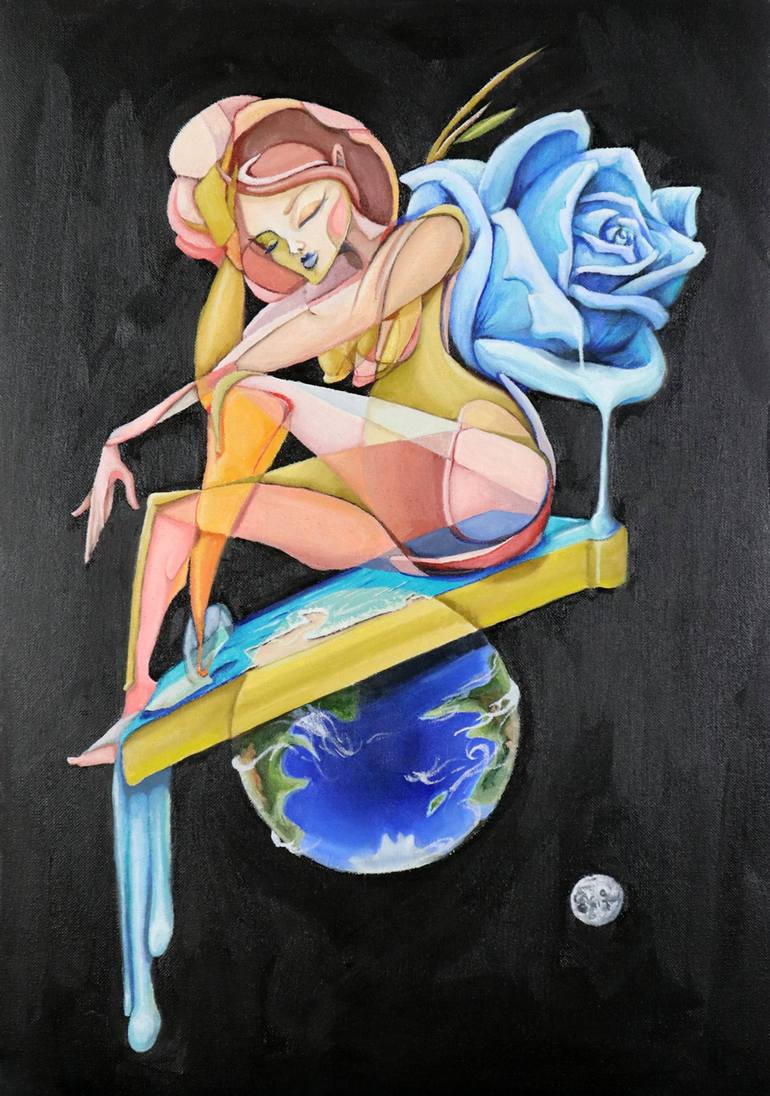 'On top of the world' was created directly after my painting 'Tilting Ocean' as my imagination wanted to explore having the ocean tilting off the horizon and into an endless sky. In this painting a figure sits on top of a platform that balances on an Earth-like planet. Outstretched behind the figu...