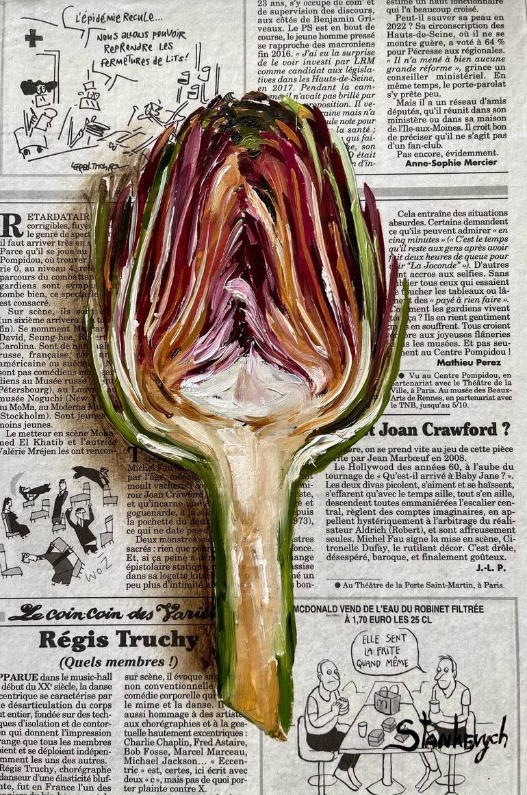 One Artichoke by Julia Stankevych oil on newspaper canvas 16x16" (40x40 cm)