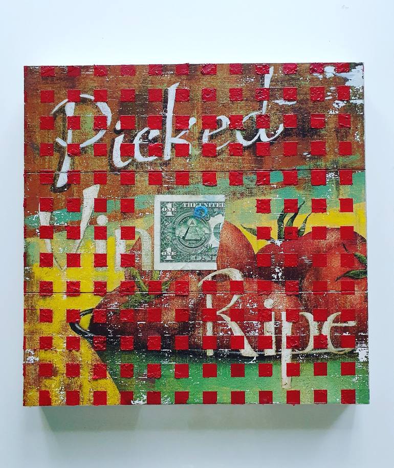 This painting is a new experiment and I try to bring new elements into my work. The half dollar is college with the really dollar.