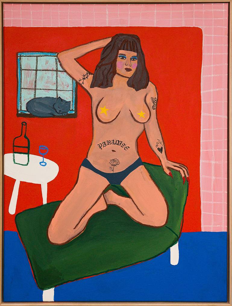 Kasia Frankowicz is a Melbourne-based artist whose work sits at the intersection of tenderness and rebellion. With bold colours, figurative forms, and a wink of surreal humour, she paints what it feels like to be alive — awkwardly, vividly, and unapologetically. Her practice draws from memory, emotion, street culture and quiet acts of defiance, often featuring recurring motifs like horses, cats, cowboys, topless women, and weird little moments that say more than words can. Born in Western Sydney to refugee parents, Kasia’s work carries a layered sense of identity — part soft nostalgia, part sharpened edge. She’s not interested in perfection. Her figures are deliberately off-kilter, her compositions both stripped back and emotionally loaded. Whether it’s a sunbather with a book on her chest or a lone cowboy lit by the moon, her work finds meaning in the mess and beauty in the banal. Alongside painting, Kasia creates soft sculptural pieces that echo the tactile, playful energy of her visual world. Her work has appeared in Frankie Magazine, Art/Edit, Voyage LA, ABC’s Artworks and more. She is also the founder of REBIRTH, a platform for creative exploration and community connection.