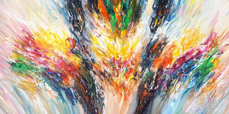 Painting: Acrylic on Canvas. Large abstract painting. Original abstract expressionism art. 78.8 " width x 39.4" height x 1.5" depth. (200 cm Breite x 100 cm Höhe x 3,8 cm Keilrahmenstärke) Original painting. Modern, colourful abstract artwork. Yellow, magenta, red, pink, orange, green, blue, lave...