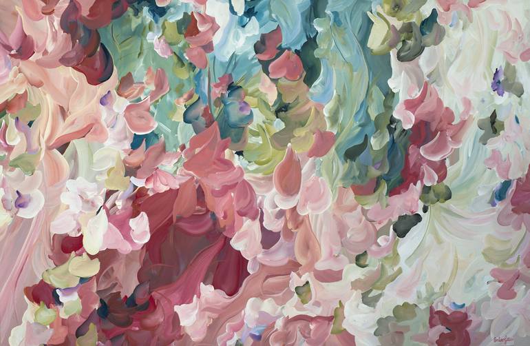 One True Love - 150x100 Large Abstract Floral landscape in a modern expressive style. A stunning contemporary colour palette of warm pinks and reds, soft beige, deep midnight blue and olive greens. Abstract Botanical artist Amber Gittins has a love for colour and movement in her paintings. She uses ...