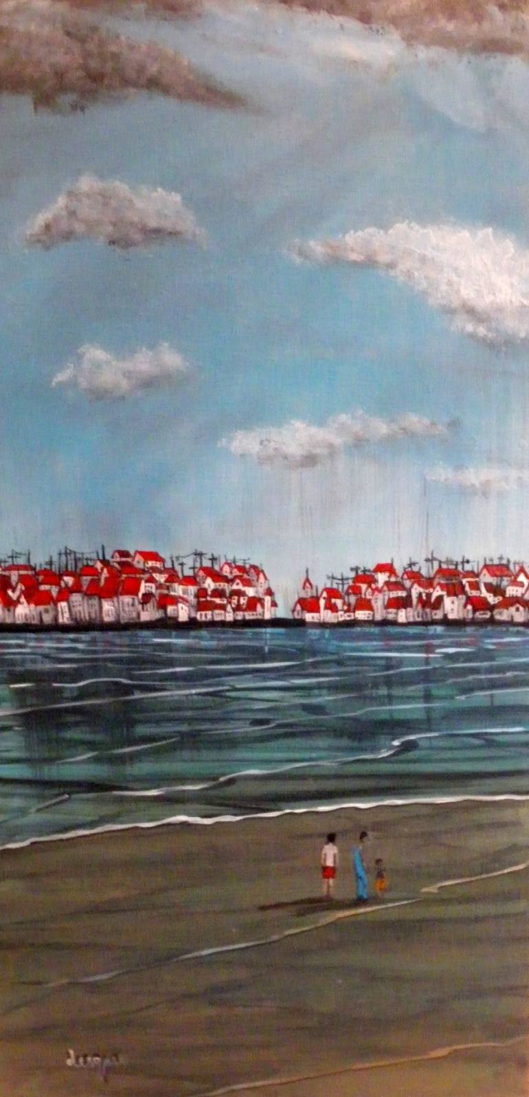 day, sea, sky, people, clouds, houses, white, blue, water, beach, mother, father, child, walk