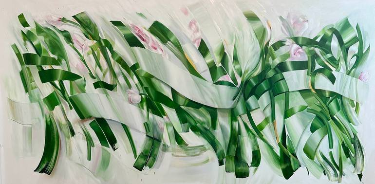The acrylic painting on a large canvas belongs to the "Hanging Gardens" series. This artwork features a range of green tones with subtle hints of pink and displays a design that evokes an imaginary garden with both abstract and figurative elements. Through this series, the artist explores themes rel...