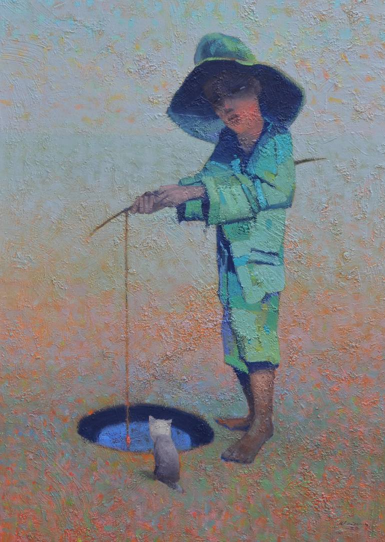 Medium size oil on canvas. Cute plot. Optimistic fisherman :)