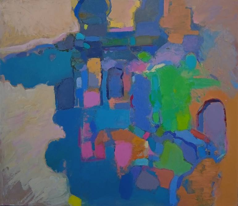 Semi-abstract painting with fortress walls plunges into atmosphere of a sultry evening .