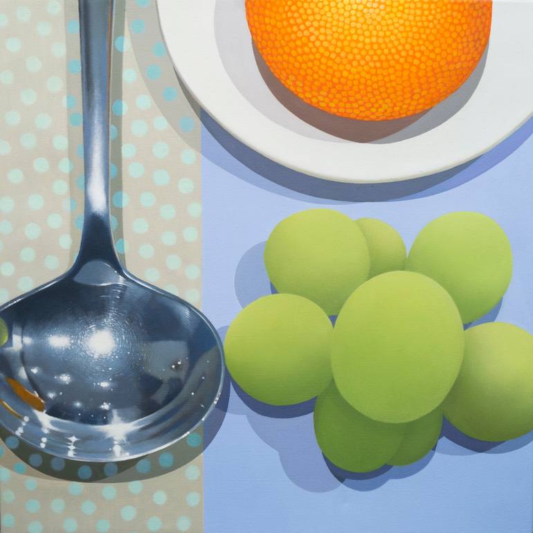 A formal arrangement of an orange on a plate, some grapes and a spoon and a companion piece to Book. Lemon. Spoon. By painting larger than life size, I wanted to open these forms up to become spaces; in the spoon a reflected room, or perhaps a starry night and the orange a large shere, a world maybe...