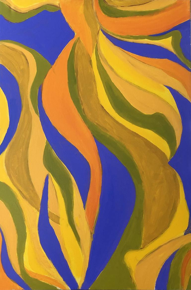 This is a pleasant abstract painting, using color, shape purely to convey the movement, rhythm, and pattern. Credit to Pattern design by Larsen Design Studio, USA, 1967, "Bojangles" 1.5 inch thick gallery canvas, the sides of the canvas were painted. Has a modern look when hanging without frame.