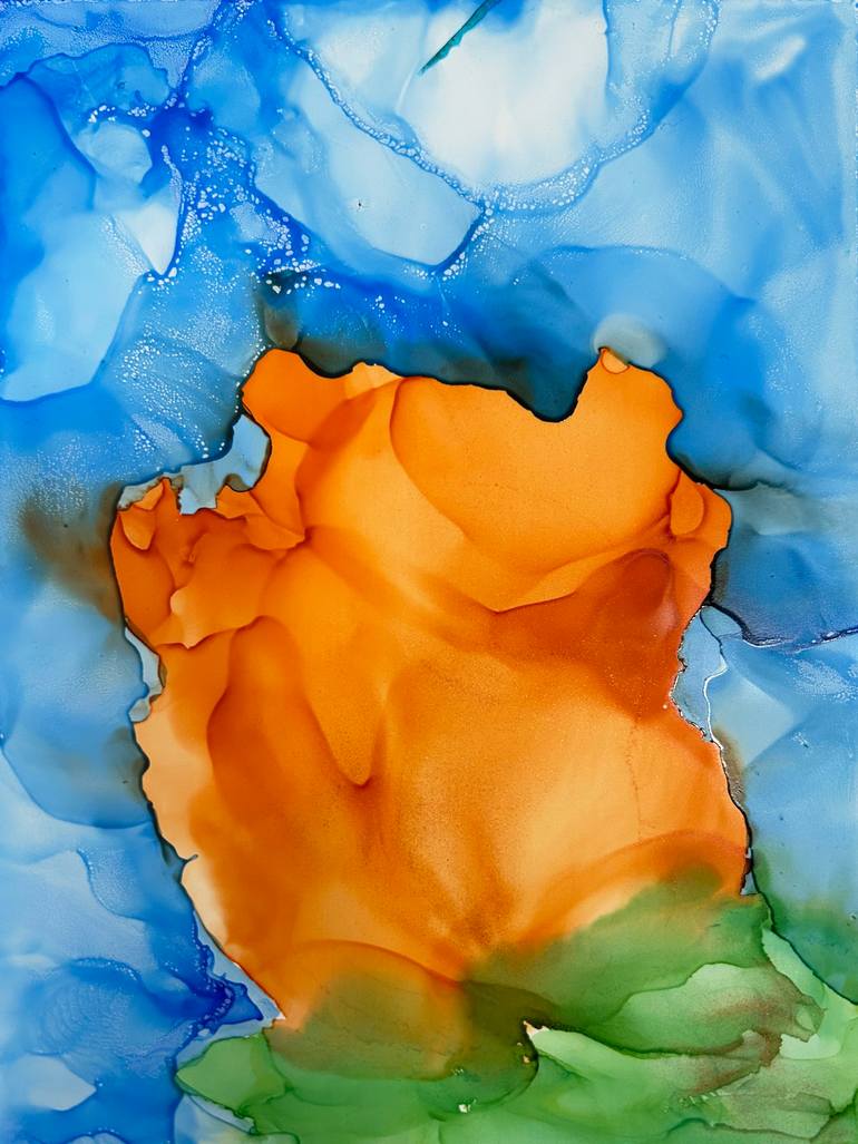 Alcohol Ink Painting Vibrant hues of blue dominate the background, while bold, fiery tones of orange and subtle green suggest a dynamic natural form of a tulip in the foreground. The fluid blending of colors creates a sense of movement and energy.