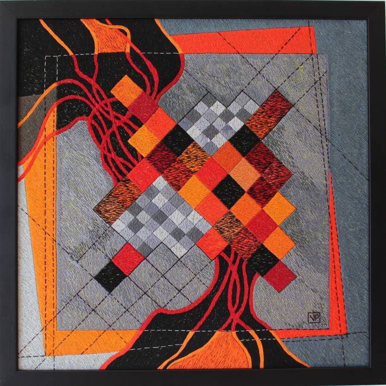 Hand embroidery, cotton threads on silk. As a visual artist, I create hand embroidered pieces of abstract, geometric, and architectural designs. Stitching resembles in many ways brush strokes however, hand embroidery with its web of colored threads laid to form positive and negative spaces adds ex...