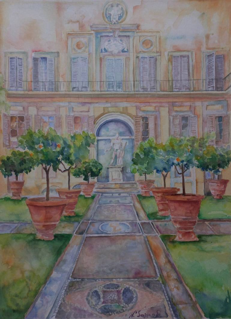 This work represents the internal courtyard of the most beautiful villas in the center of Florence, Villa Medici Riccardi, with its garden and orange trees. Watercolour original painting on paper 450 gr (210 lbs)