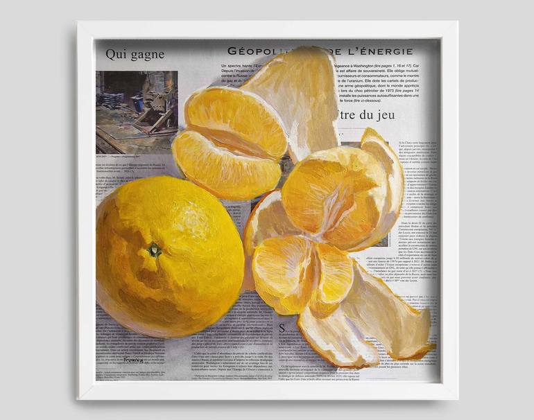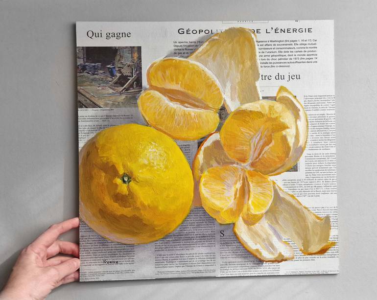 Orange painting on newspaper, original art. Painting with citrus fruits, wall decoration for dining room. A unique gift idea for everyone. - Title: Oranges - Size: 40x40 cm / 15,7x15,7" - Materials: oil, newspaper, panel, UV protection. - the painting is unframed Due to different monitor settings ...