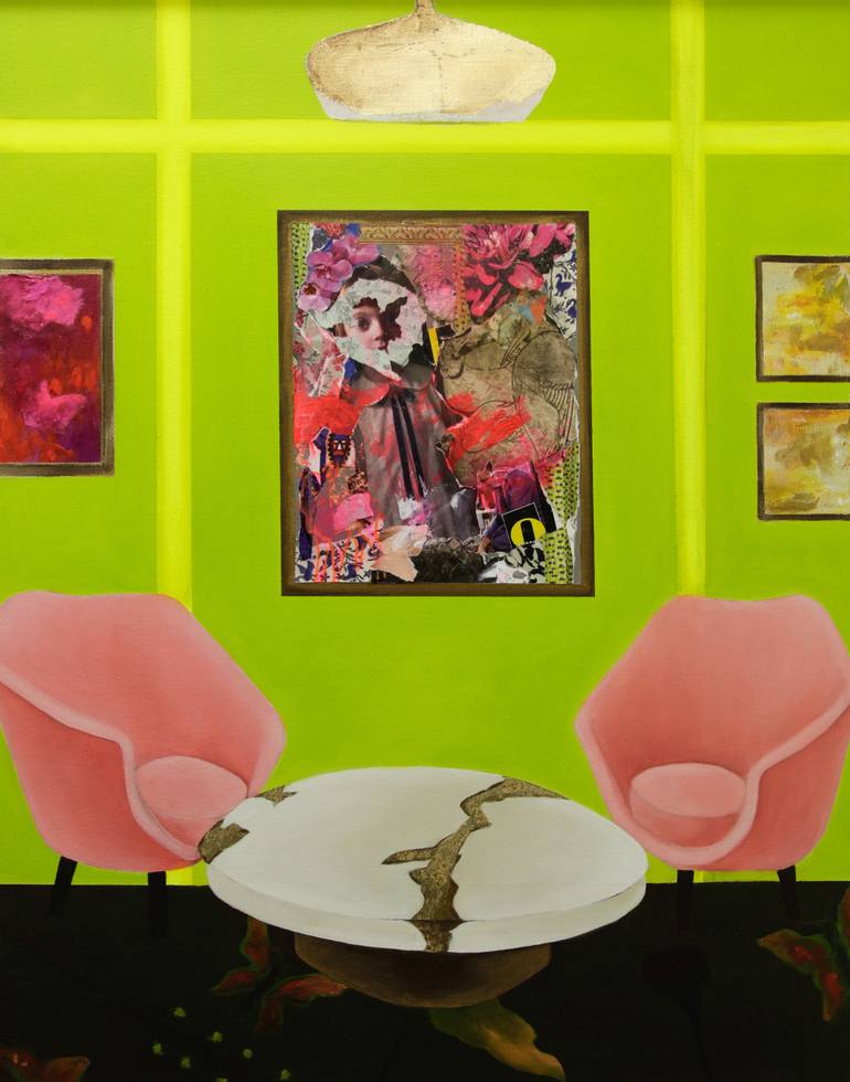Dawn's latest work "The Possibility of Home" sets out to purposely contradict the increasing norm of modern minimalist interiors. For her interior spaces she has created a series of paintings and collages within the painting, set within modernist interiors.