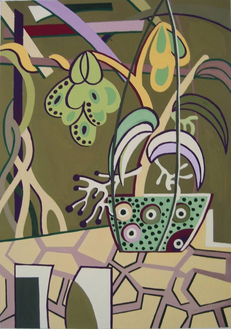 Orchid Trellis in Bloom The painting depicts a trellis of blooming orchids in a home garden. The orchids are in full bloom in a variety of colors, from light purple to dark pink. The lush green leaves create a cheerful and vibrant scene. The painting is painted with acrylic, giving it a bright and ...