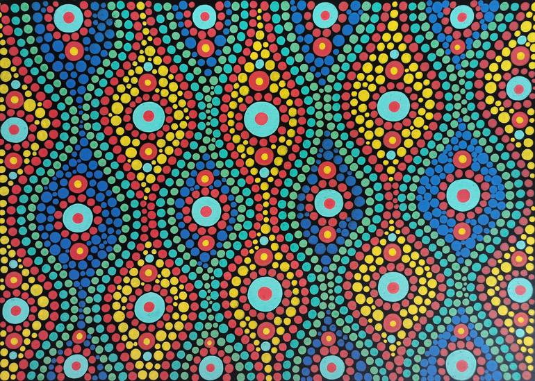 A colorful and vibrant abstract painting with circles ans waves. This is an original one-of-a-kind hand-painted artwork. Painting is NOT FRAMED, photos with frames are just for example of interior design. The artwork is painted with professional acrylic markers on high-quality black paper of 300 gsm...