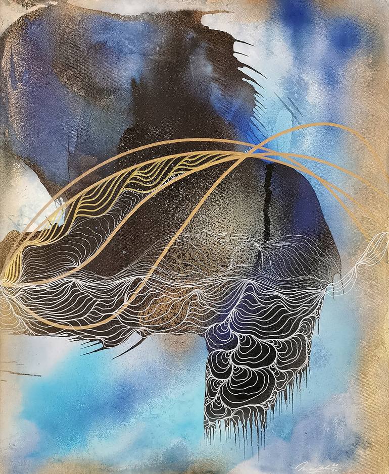 The work of Marijah Bac Cam questions the Memory of the Living through the Languages of the Feminine Principle (creative principle of Nature) by means of drawing, painting and increasingly photography and video. What does this chaos of fullness and emptiness mean, enhanced with dots, curves, golden wefts and gestural writing? In the artist's painting we perceive a Living being organized before our eyes, starting with the diffusion of black ink. These dark masses mingle with another color to symbolize the different elements, air, water, fire, earth, ether. Suddenly an organic mesh forms on the surface, connected to the misty depth. It is a question of reversal, as if to lead our gaze towards an inner world, that of the organs, tissues, vessels of an unrepresented body. These drawings express more sensibly an intuitive word in a vegetal and vibratory atmosphere that are our buried memories. They are the representation of the original past in a form that is no longer mental but metaphorical. Graffiti sometimes float here and there, like a palimpsest as if to inscribe a forgotten verbal dimension and question the meaning of forms. Her work evokes images that are almost figurative but difficult to identify. It's a question of everyone's point of view, seen from the sky or underwater, in macro or even in a wide shot. This collective memory seems to define and tell terrestrial and extra-terrestrial landscapes. Does Nature have a universal language that hides in our memory?