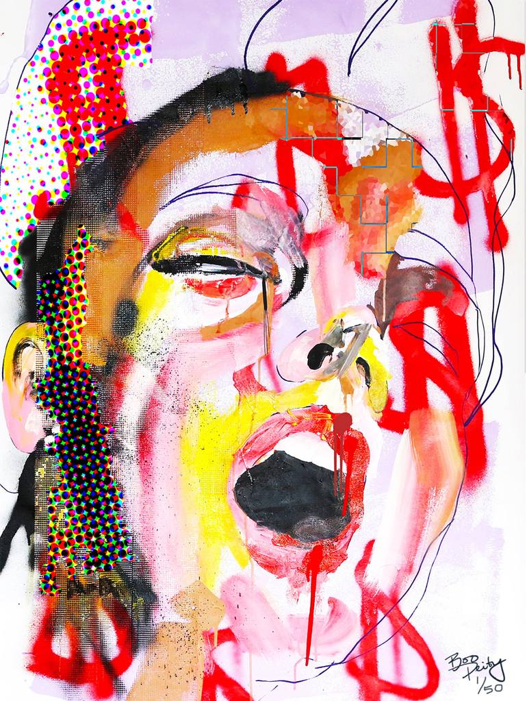 Experience the tension between a beautiful face, and a complicated soul. Pop Art Painter Boo Deity paints the layers of an exhausted graffiti wall on canvas. She uses her hallmark neon colors in contrast with chalky pastels. Drippy oil paint reflects the dripping facade of what we thought we knew about popular icons. Layers of witty sayings and street tags allure you into a joke where the punchline sits on a bench at a quiet museum, waiting for you to laugh out loud. Her style begs a compassion from you; people are not what they appear to be on the outside. Boo Deity inspires those who feel outcasted. Her personal devotion to painting is a dedication to rewriting her family’s history of mental illness. She is inspired by trips to the Art Museum, music, and dance. Her technique is perfectly messy, she uses acrylic paint, oil paint, fabric, and digital techniques. Boo Deity is an established Pop-Art Painter since 2016. She was born in Kentucky and graduated Magna Cum Laude from Mount St. Joseph, Cincinnati, OH with a degree in English and a minor in International Art. She is in her high school basketball Hall of Fame and played NCAA women’s basketball in college. Boo Deity sold over 2 million dollars of Contemporary Art as an Art Consultant from 2011-2016. Her business, Street Stains™, uses a propriety printing and sewing technique and has been featured in over 200 art shows around the U.S.