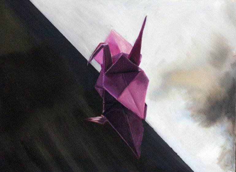 A loose painting of a Origami Crane on a mirror during sunset. This Original Oil Painting is finished with a high quality removable semi-gloss varnish. This painting arrives ready to hang via the pictured 3″ Plein Aire Gold Leaf wooden frame secured by 30lb wire and d-rings