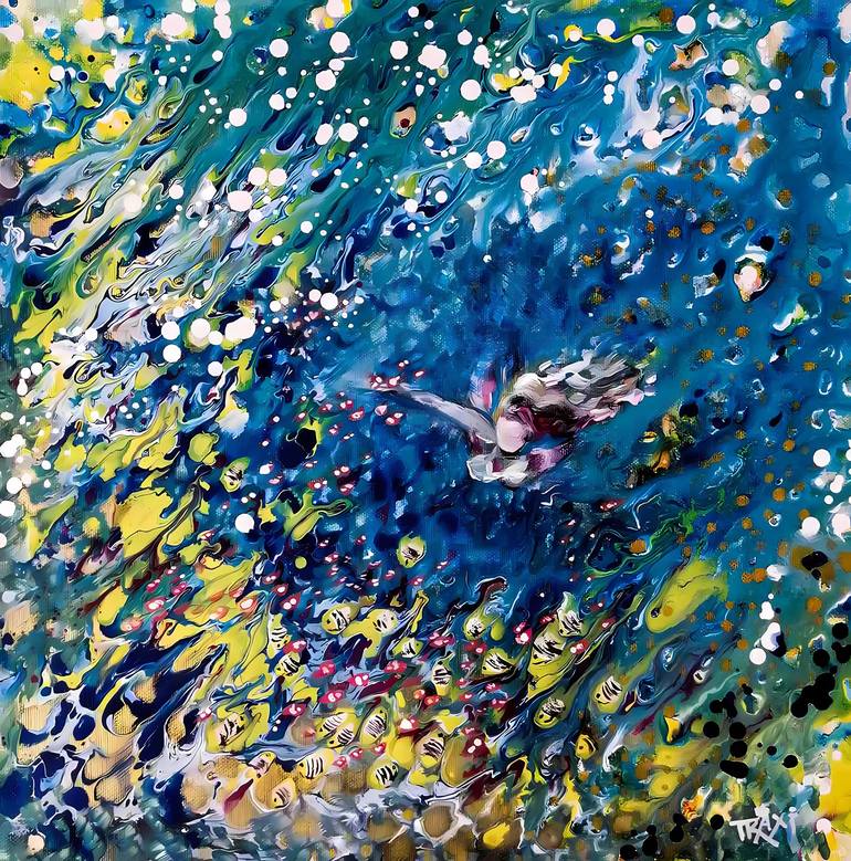 Original Abstract Underwater Painting with Woman Product Details: • Original acrylic painting on canvas • Size: 40/40 cm (16/16 inches) • Includes a certificate of authenticity signed by the artist • Secure packaging for delivery Description: Dive into a world of serene beauty and timelessness with...