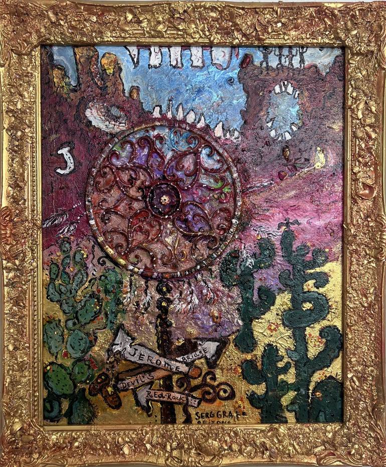 This vibrant and texturally rich acrylic mixed media painting titled "Arizona Grand Canyon Adventures" by Serg Graff captures the wild spirit of the American Southwest in a uniquely surreal and expressive style. Dominated by a large, ornate circular motif resembling a wrought iron window or dreamcat...