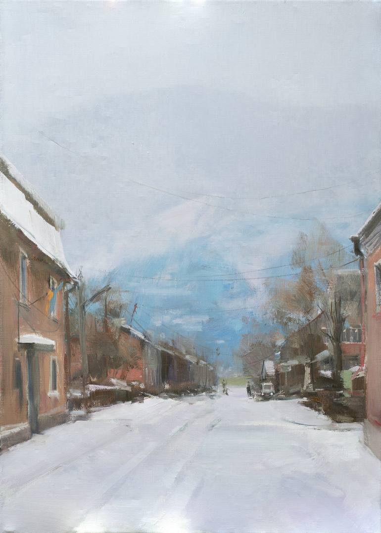 This breathtaking painting titled "Whispers of a Winter Sky," belongs to my Landscape Collection 2022. The winter landscape oil artwork captures the serene beauty of Rakhiv, a charming small town nestled in Ukraine. The scene evokes a deep sense of peace, as the snow-covered street stretches into th...