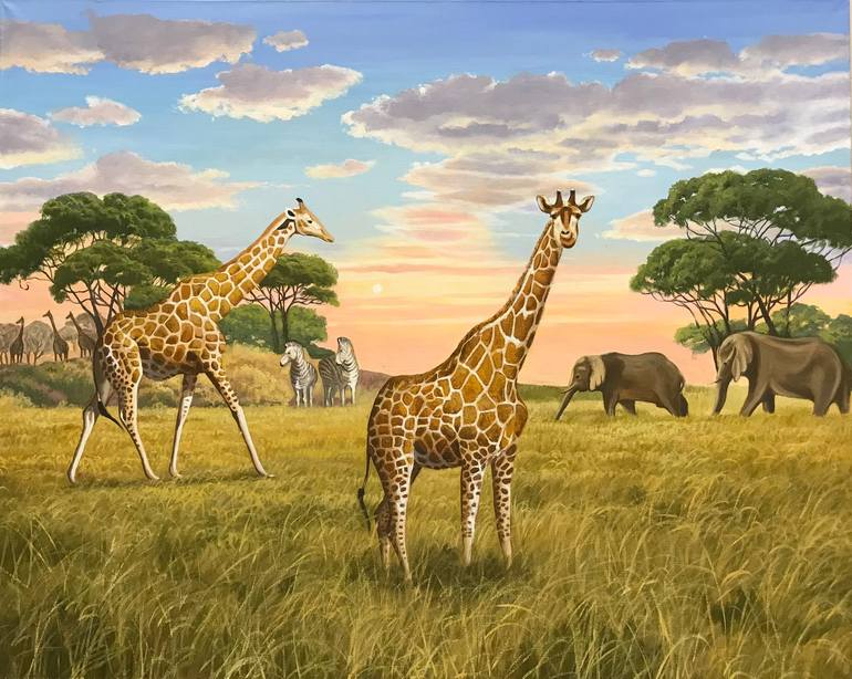Original description "Animals of the African continent " Size 100x80 cm 2023 The incredible beauty of nature and the sunsets of Africa inspire me to create a new picture every time. In this picture, I drew together several different species of animals, against the background of the setting sun. Suc...