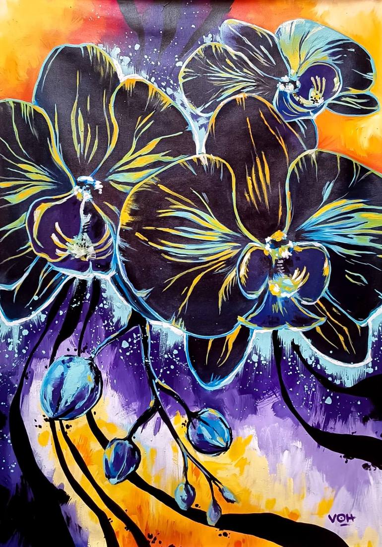 Vibrant and glowing, "Orquideas negras" captures the exotic energy of orchids in motion. Bold lines and neon contrasts evoke a surreal, dreamlike jungle lit from within.