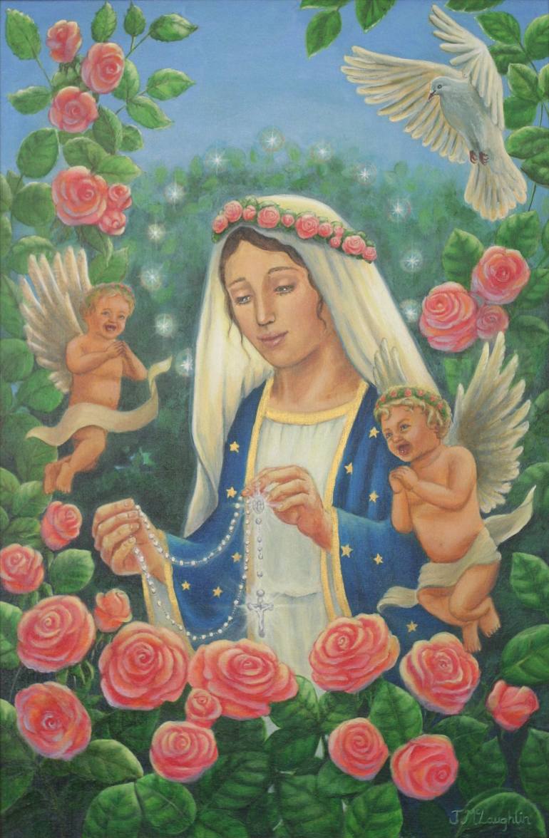 I was inspired to draw and paint this image whilst learning to pray the Holy Rosary. It is my painting of Our Lady, in a beautiful rose garden in Heaven, holding the Holy Rosary, there are some Cherubs and the Holy Spirit appears as a Dove. Our Lady is showing us that when we pray the Holy Rosary, t...