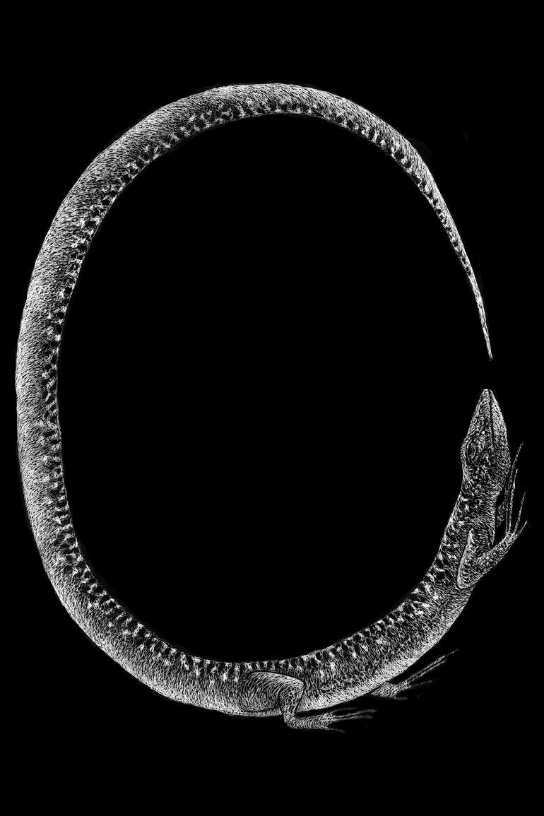The ouroboros is often interpreted as a symbol for eternal cyclic renewal or a cycle of life, death and rebirth. Artistic technique: scratchboard It was a very slow and meticulous job because every single mark was made with a pin with which I engraved the black paint on a trasparent plastic sheet ...