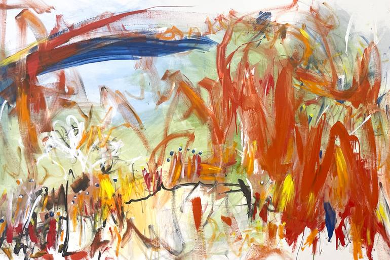 Out There is an original painting by Cheryl Harrison. This energetic fusion of acrylic and pencil captures raw emotion in each stroke. The abstract expressionism piece conveys life and movement in the landscape through its bold palette of bright blues, light green, grey, black orange, red, yellow a...